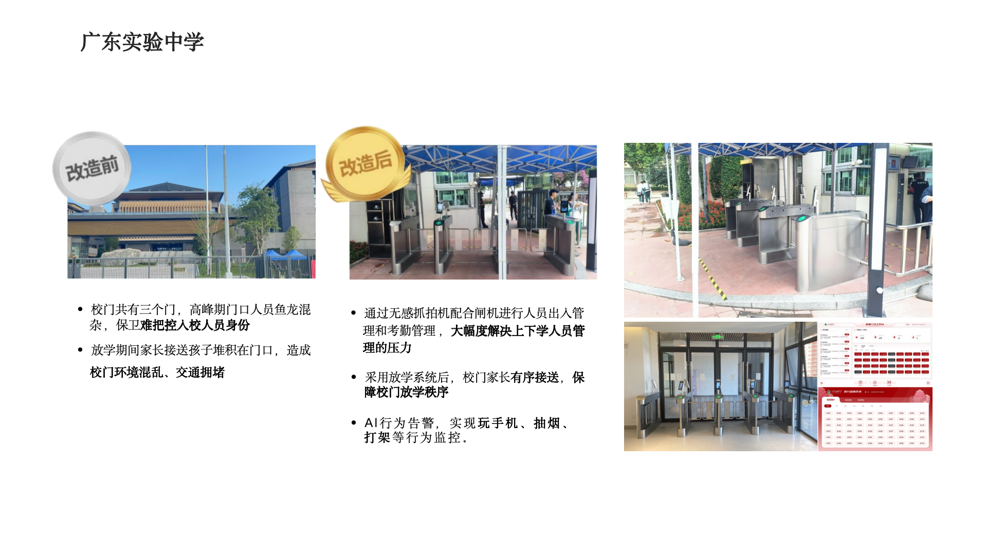 该智慧校园方案通过无感抓拍闸机、AI 行为告警等系统,解决了校门人员混杂、放学拥堵等问题,实现了校园出入、考勤与安全的智能化管理。