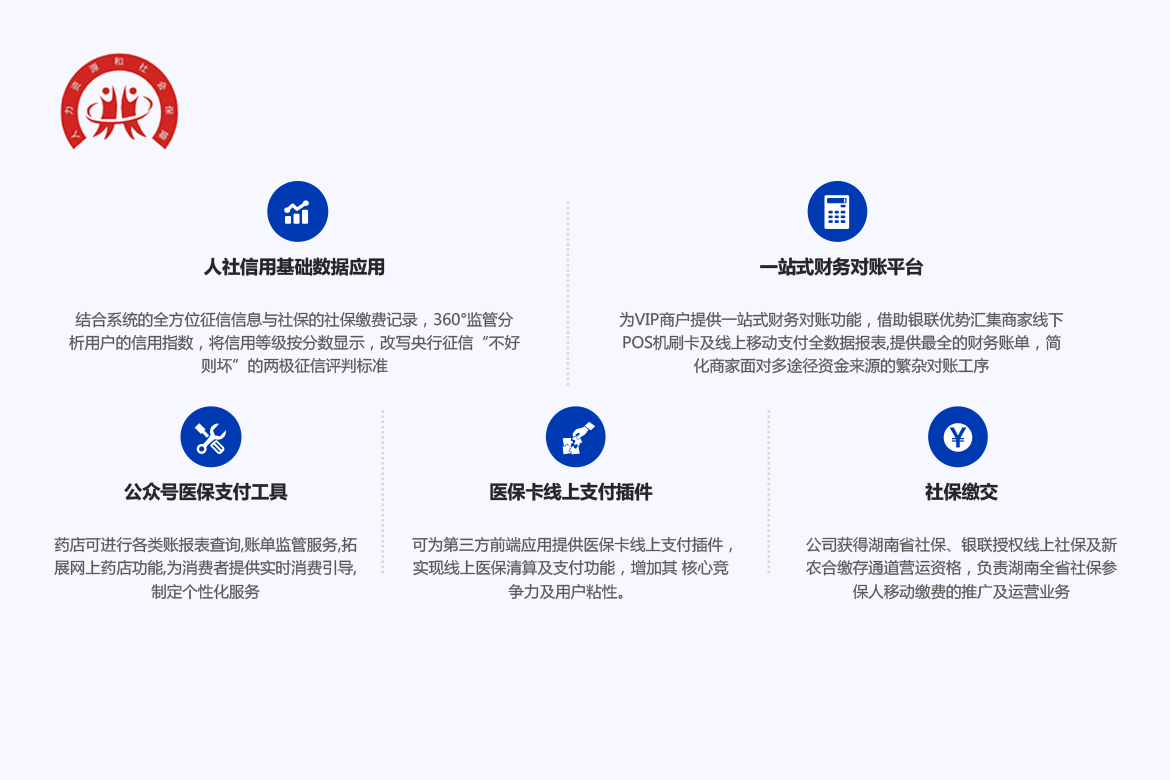 平台提供创新“互联网+人社“服务,支持手机终端和POS机终端等所有前端应用,实现线上社保支付、结算、大数据挖掘等功能。为政府、银行、医院等提供全方位服务。2018年在贵州省落地。
