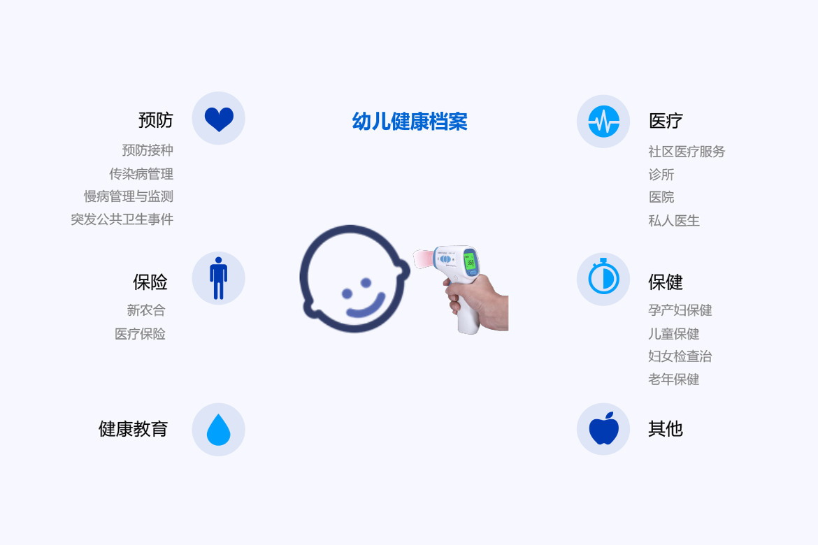 本平台帮助幼儿园建立幼儿健康档案,提供方便的晨检工具,对接卫生信息平台,以幼儿健康信息为主线,逐步建立居民健康档案,做到信息“一点采集,多点应用,自动推送”,实现居民健康卡、健康档案、电子病历的应用、融合和共享。