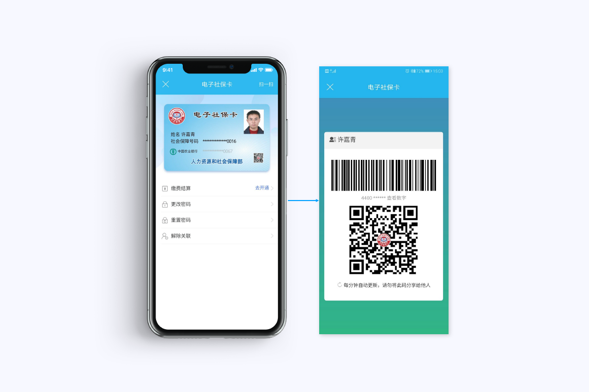 可通过 APP 调出含个人信息的电子凭证页与动态条码 / 二维码,实现扫码办事、缴费结算等便捷人社服务。
