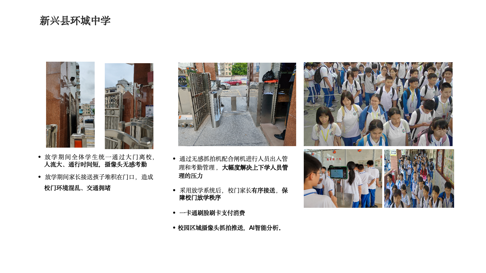 通过无感抓拍闸机、AI 智能分析等智慧校园系统,解决了上下学人流拥堵、校门秩序混乱等问题,实现了校园出入、考勤与消费的智能化管理。