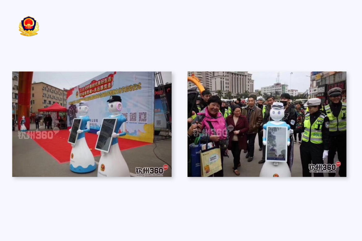 钦州市公安政务机器人被应用于钦州市公安出入境、户政、交管所三大业务大厅,为市民提供便利的业务办理以及相关资讯、智能迎宾、天气播报、宣传广告、互动资讯、民意征集以及导航功能。配合手机 App 控制端,以及机器人管理后台,推动办事大厅进行智能化建设,降低人力成本,提高办事效率,响应服务业智能化,提高服务厅形象。